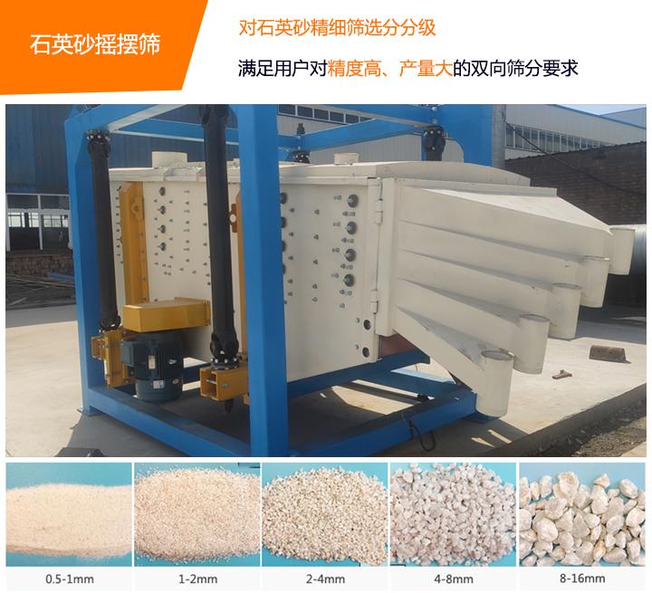 石英砂搖擺式主要是對石英砂精細(xì)篩選分級,石英砂搖擺篩篩網(wǎng)常用規(guī)格有:0.5-1mm、1-2mm、2-4mm、4-8mm、8-16mm、16-32mm、10-20目、20-40目、40-80目、100-250目。石英砂搖擺篩是解決因旋振篩精度高但產(chǎn)量小、直線篩產(chǎn)量大但精度低這類篩分問題而設(shè)計的,該款設(shè)備設(shè)計預(yù)案中具備了篩分精度高、產(chǎn)量大的特性,可以滿足用戶對精度、產(chǎn)量雙向要求的篩分要求。