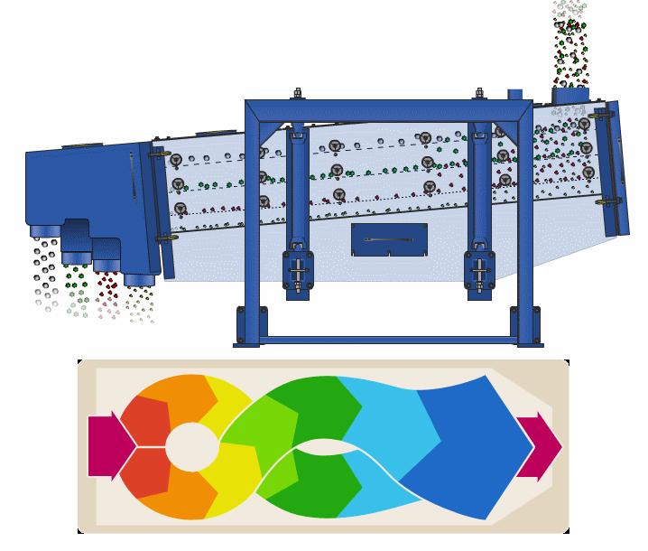 石英砂方形搖擺篩的篩箱在慣性力的作用下作前后往復(fù)運動,并帶動篩面做周期性搖動,促使篩面上的物料隨篩箱一同做定向跳躍式運動,小于篩面孔徑的物料通過篩框落到下層,稱為篩下物,大于篩面孔徑的物料經(jīng)連續(xù)翻滾跳躍運動后從前端排料口排出,繼而完成篩分作業(yè)。