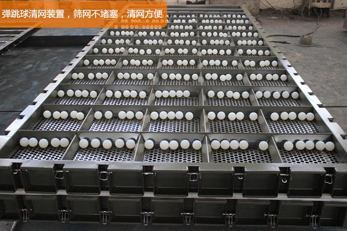 2、裝有彈跳球清網(wǎng)裝置,此清網(wǎng)形式系統(tǒng)通過布設(shè)在篩網(wǎng)下、托球板上面的高性能彈跳球不規(guī)則的擊打篩網(wǎng),靠二次諧振完成清網(wǎng)防堵,其內(nèi)部結(jié)構(gòu)如圖4所示。此結(jié)構(gòu)簡單易行、效果顯著,適用于大多數(shù)篩分作業(yè)的清網(wǎng)和防堵。